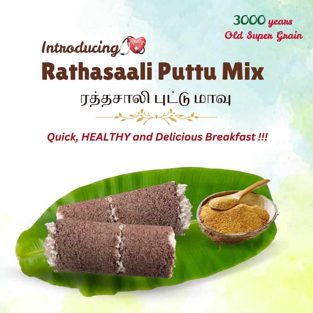 You can make puttu with all kinds of rice flours made from different varieties of rice like Ponni, Thooyamalli rice, Poongar, Sivappu Kavuni (Red Rice), Mappillai Samba (Bridegroom Rice), etc.., and also using millet flour like Ragi (Finger Millet), Kambu (Pearl Millet). Each one brings its own taste and texture to the table. Along with these, one of our personal favorites is making puttu using the Haemoglobin Booster – “Rakthashali Rice”. Today, we’re making it the easy way, with our instant puttu mix, made from Rathasaali rice.
