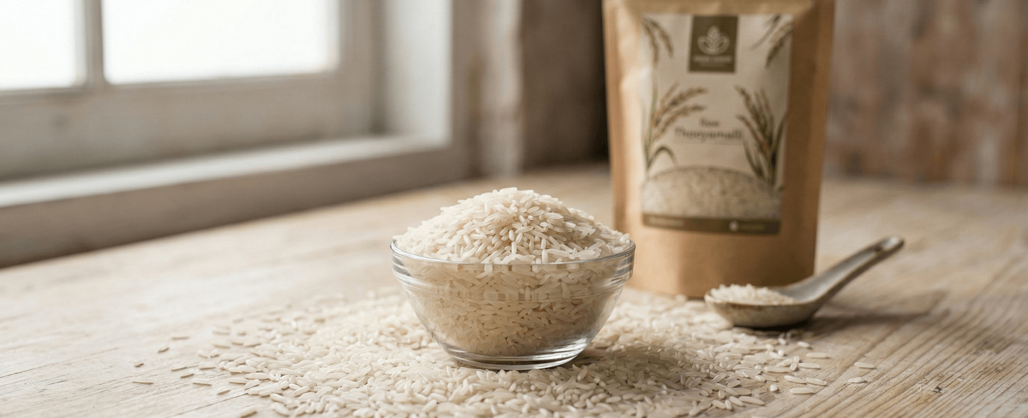 In Tamil households, particularly in the Cauvery delta region, Thooyamalli rice held a special place. It wasn’t the everyday rice. It was the rice for festivals, for guests, for special occasions when you wanted the meal to be memorable. The name itself tells you this: “Thooya” means pure, “Malli” means jasmine. Pure jasmine rice.